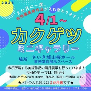 桜ホール内に展示している【カクゲツ・ミニギャラリー】の作品が入れ替わります。 スペースの関係上、多くの作品を展示することはできませんが、2か月間じっくりと作品を味わうことができます。 4月1日~5月末までの […]